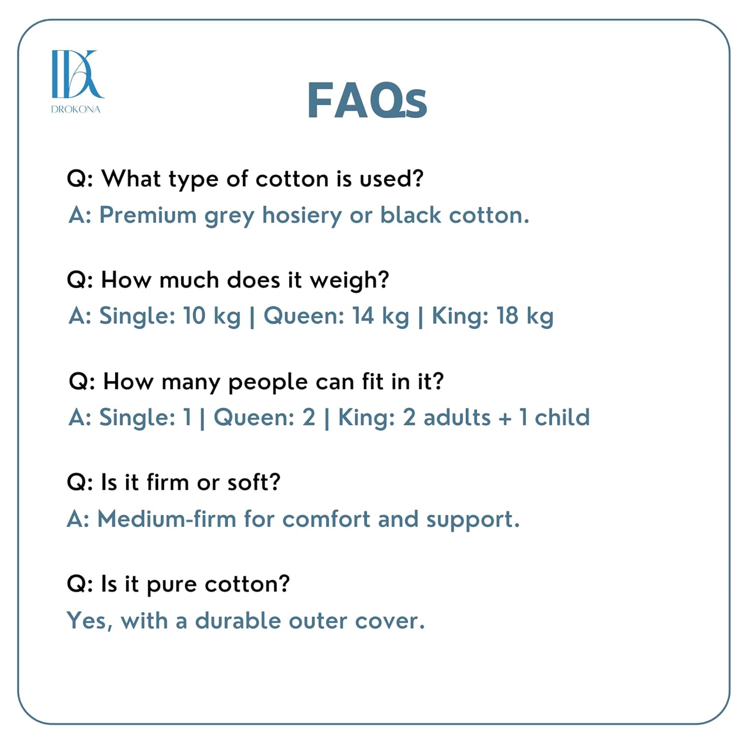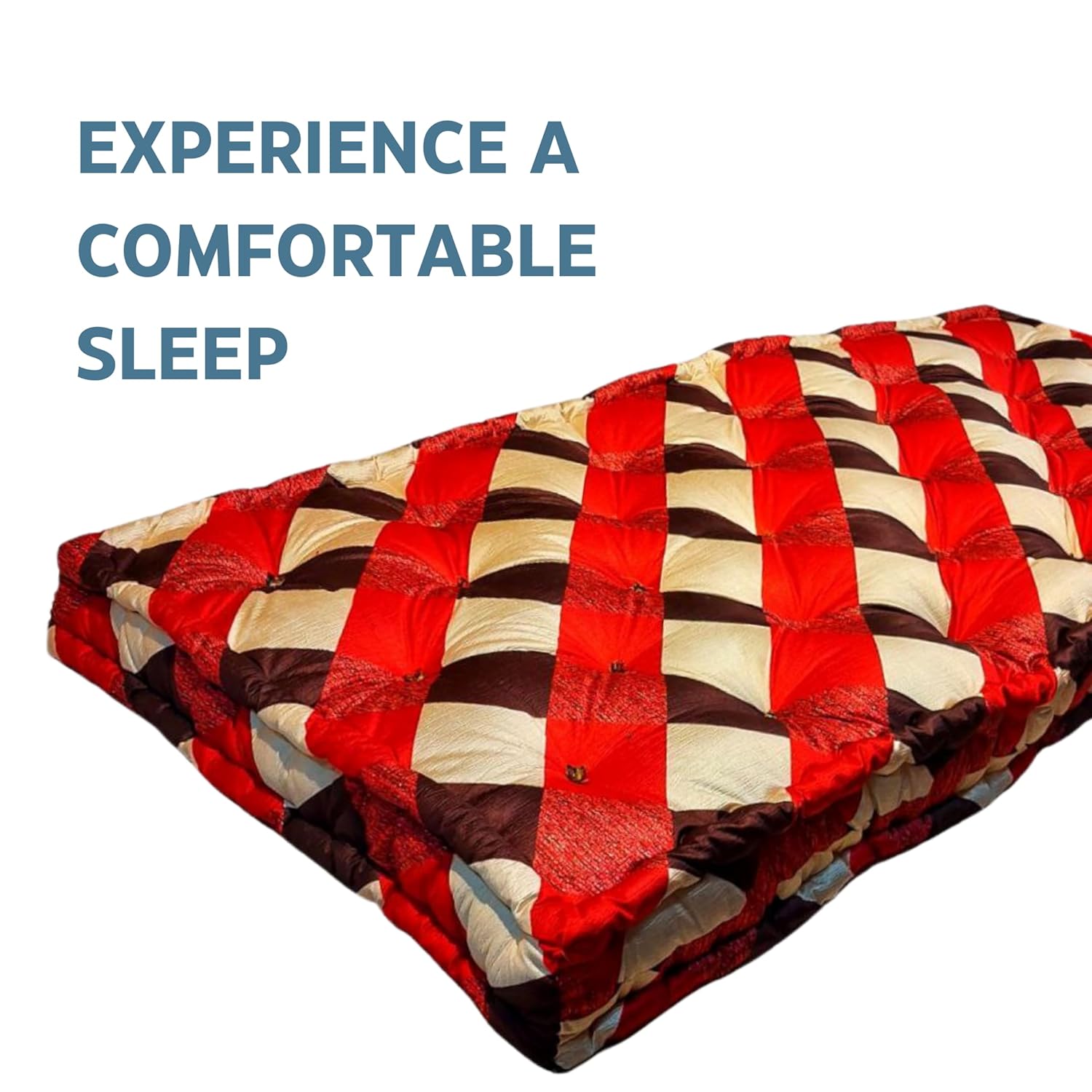Inspired by Japanese Shikibuton Standards: Designed to deliver premium comfort, this single-bed mattress (72 x 72 inches) is lightweight and versatile, ideal for various sleeping setups. Premium Quality Black Cotton: Made with high-grade black cotton for durability and plush comfort. Perfect for use as a floor mattress, on a bed frame, or as a foldable option for compact spaces. Orthopedic Support: Provides firm, even support, recommended for those seeking relief from back discomfort. This cotton mattress ensures long-term body alignment, making it a great alternative to foam mattresses. Sag-Free Durability: Packed with ample cotton filling to prevent sagging over time, ensuring the mattress remains comfortable and supportive for years. Hypoallergenic & Sustainable Materials: Crafted with hypoallergenic black hosiery cotton, this mattress is 100% recyclable and ideal for allergy-prone users. All-Weather Comfort: The breathable cotton fabric ensures a cool sleeping surface during summers and a cozy feel in winters, making it perfect for year-round use. Versatile Use: Whether used as a mattress for single beds, as a folding mattress for compact storage, or a mattress on the floor, this product is suited for various sleeping needs. All-Weather Comfort: The top layer features breathable cotton fabric, keeping you cool and comfortable in all seasons.